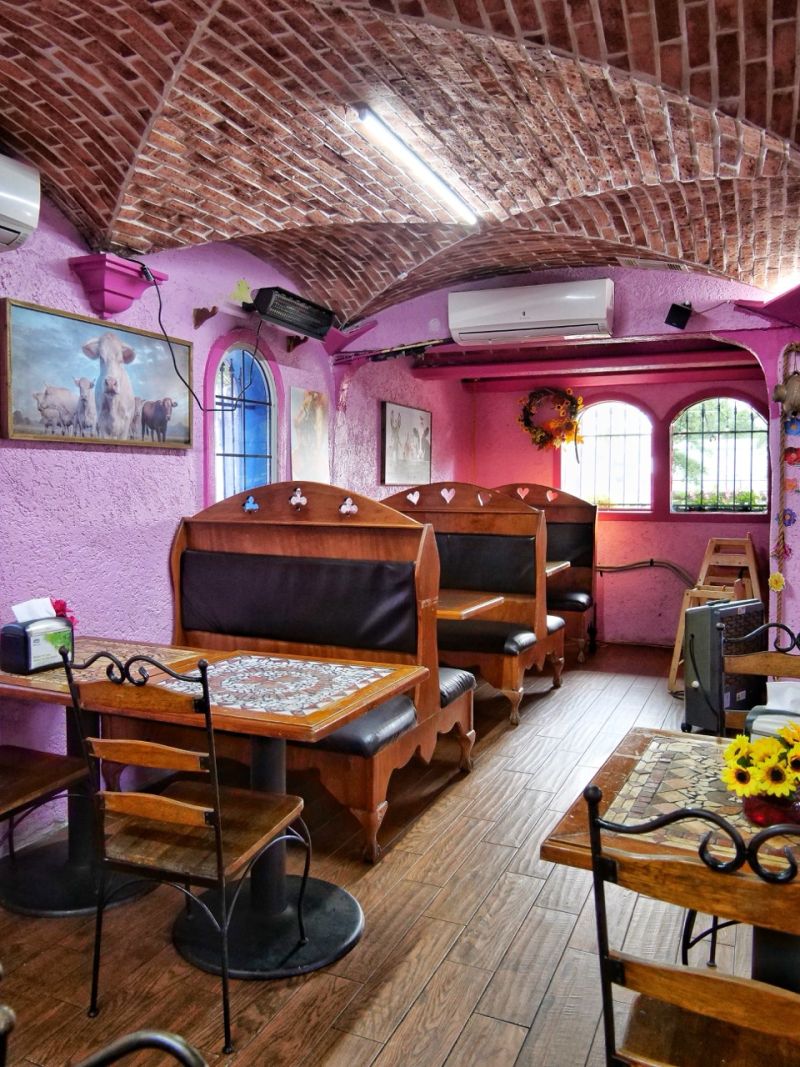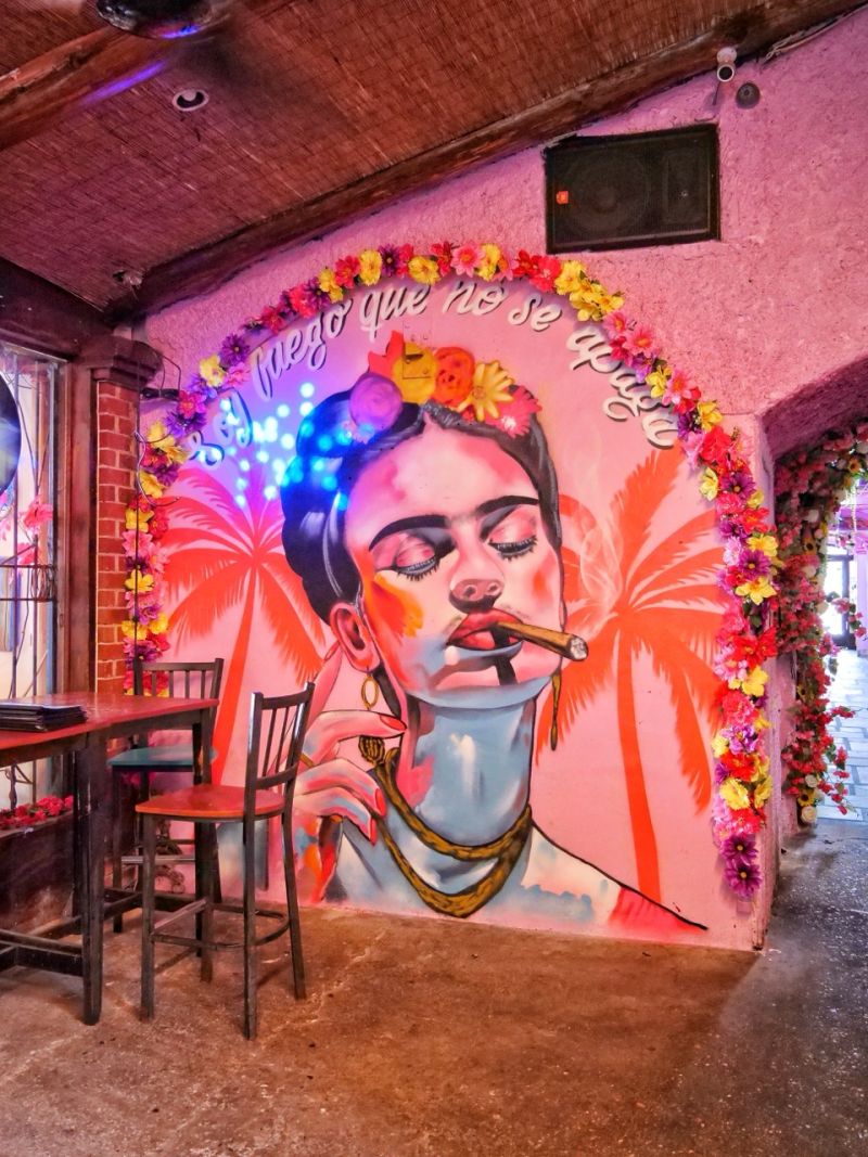 The space is like a maze of surprises. It opens up into a lively, multi-area dining experience that includes indoor tables, a covered patio, outdoor picnic seating, and even private gazebos—each one decorated with lush florals or bold murals inspired by Frida Kahlo’s iconic style. Multiple parties could be here and never interact; that’s how much space there is!