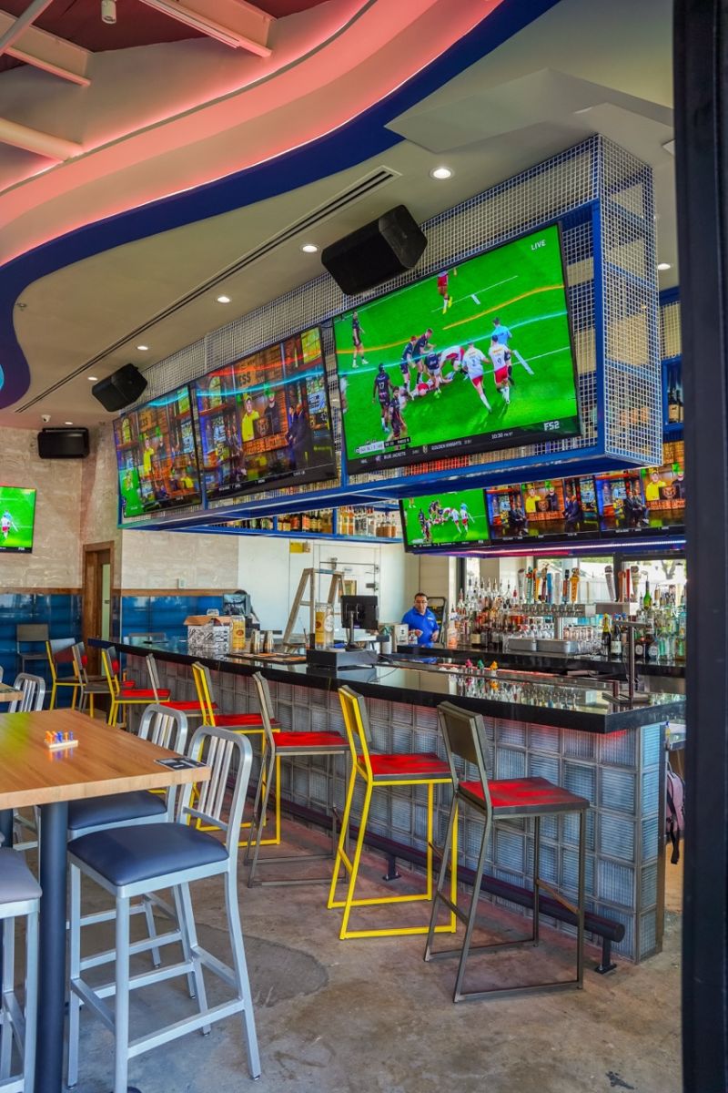The outdoor space is huge, featuring three sand volleyball courts available for rent, along with cornhole lanes, tons of covered seating, and a massive outdoor screen for watching the game. Inside, the vibe continues with a full bar and more TVs, so no one misses a play. It's easy to see why this place has become a go-to for everything from team outings to Sunday watch parties.