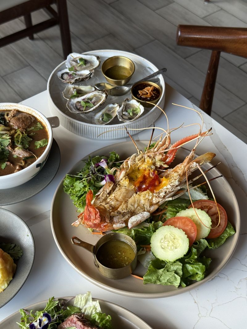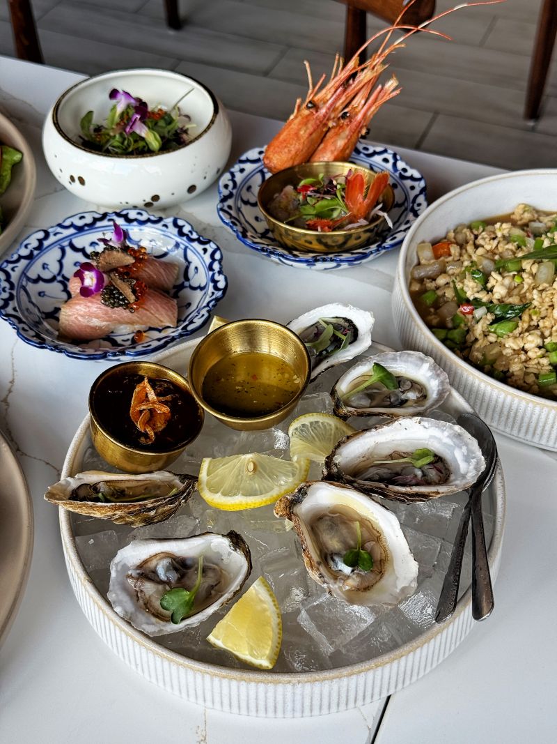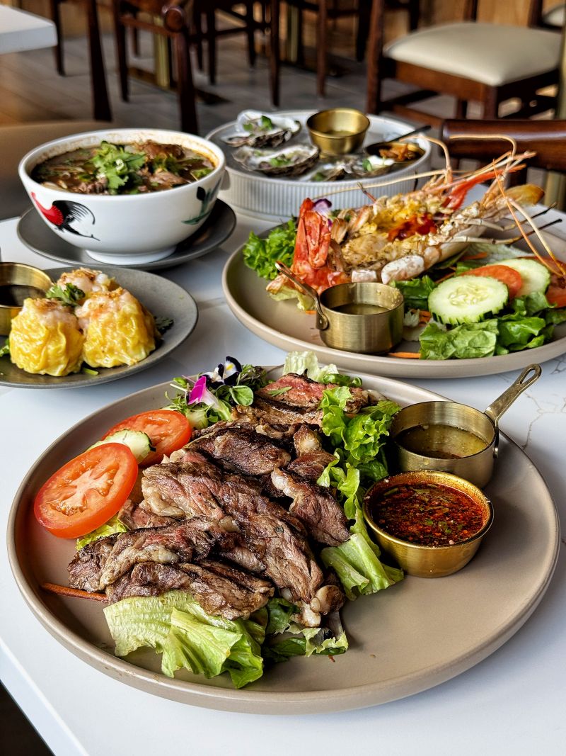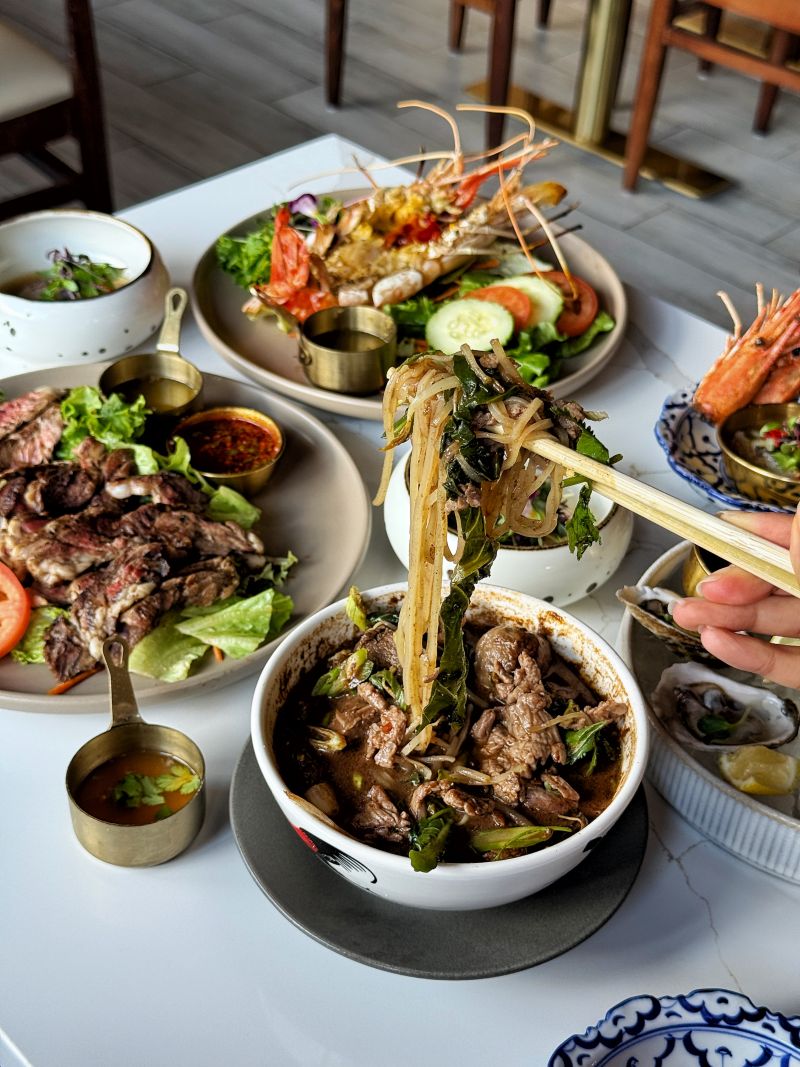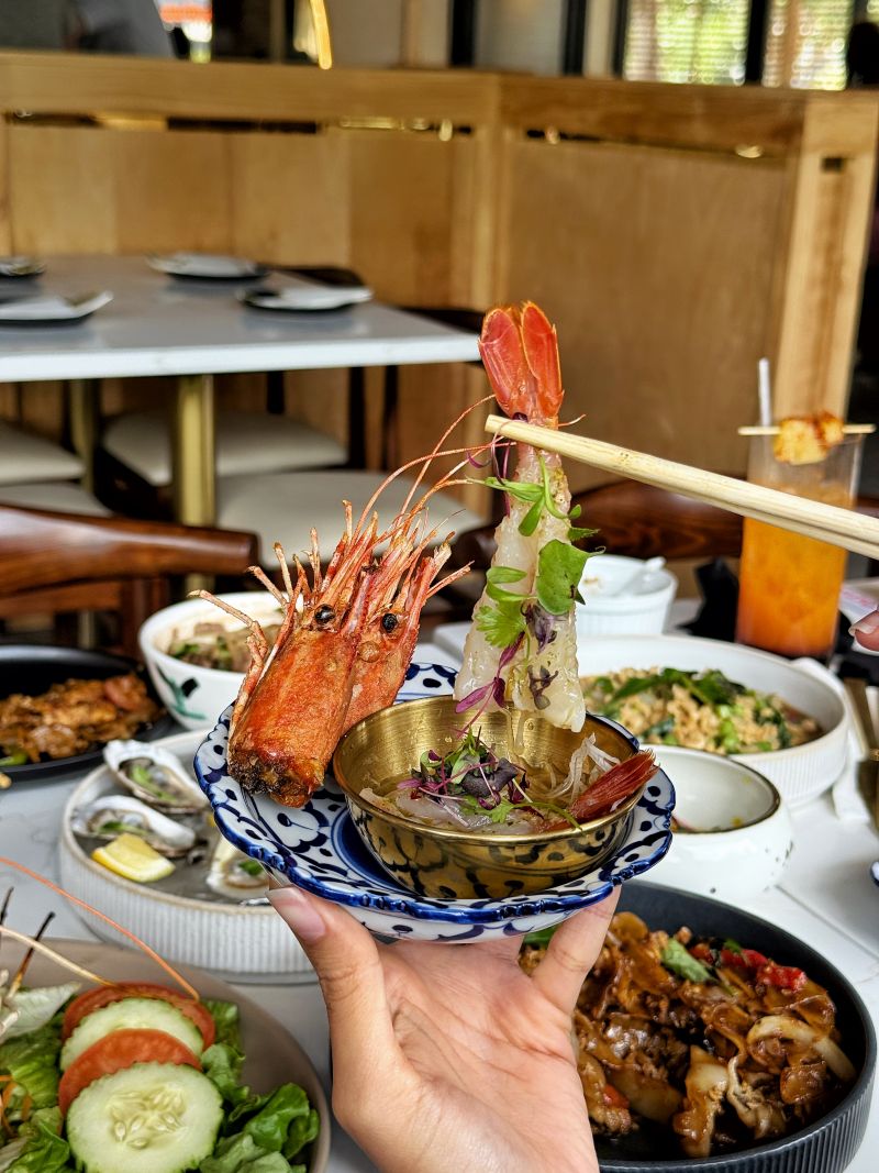 The menu perfectly balances freshness and flavor, moving seamlessly from bright, citrusy hamachi crudo to comforting Thai favorites like Pad Kee Mao, River Prawn, and Tiger Cry. One standout not to miss is the Silk Shrimp Dumplings—a family recipe!