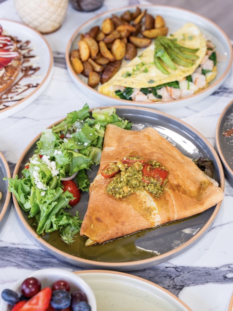 The interior is made for brunch photos—with a flower-lined feature wall, a faux tree arching over the tables, and beautifully plated, Instagram-worthy dishes to match. The menu features a mix of sweet and savory crepes, brunch plates, and a full lineup of coffee and tea drinks. Their desserts are made with authentic Belgian chocolate, which gives everything a decadent, velvety richness without being overpoweringly sweet. You’ll finish your plate—and probably think about ordering another.