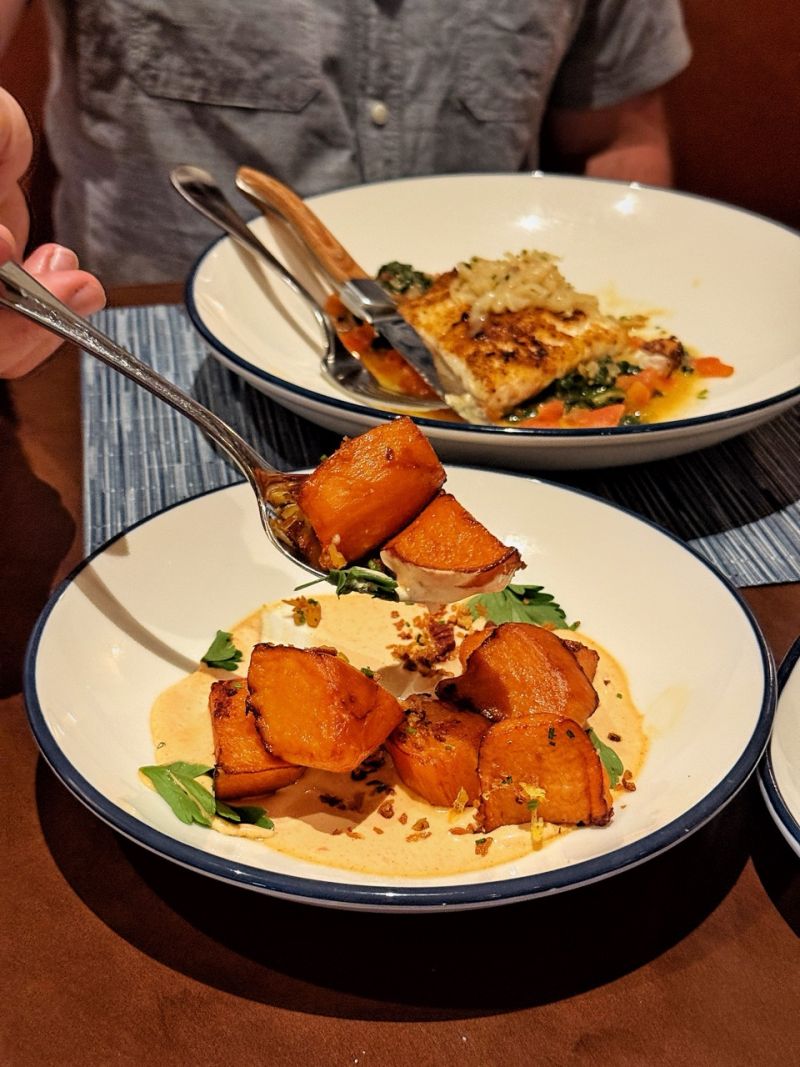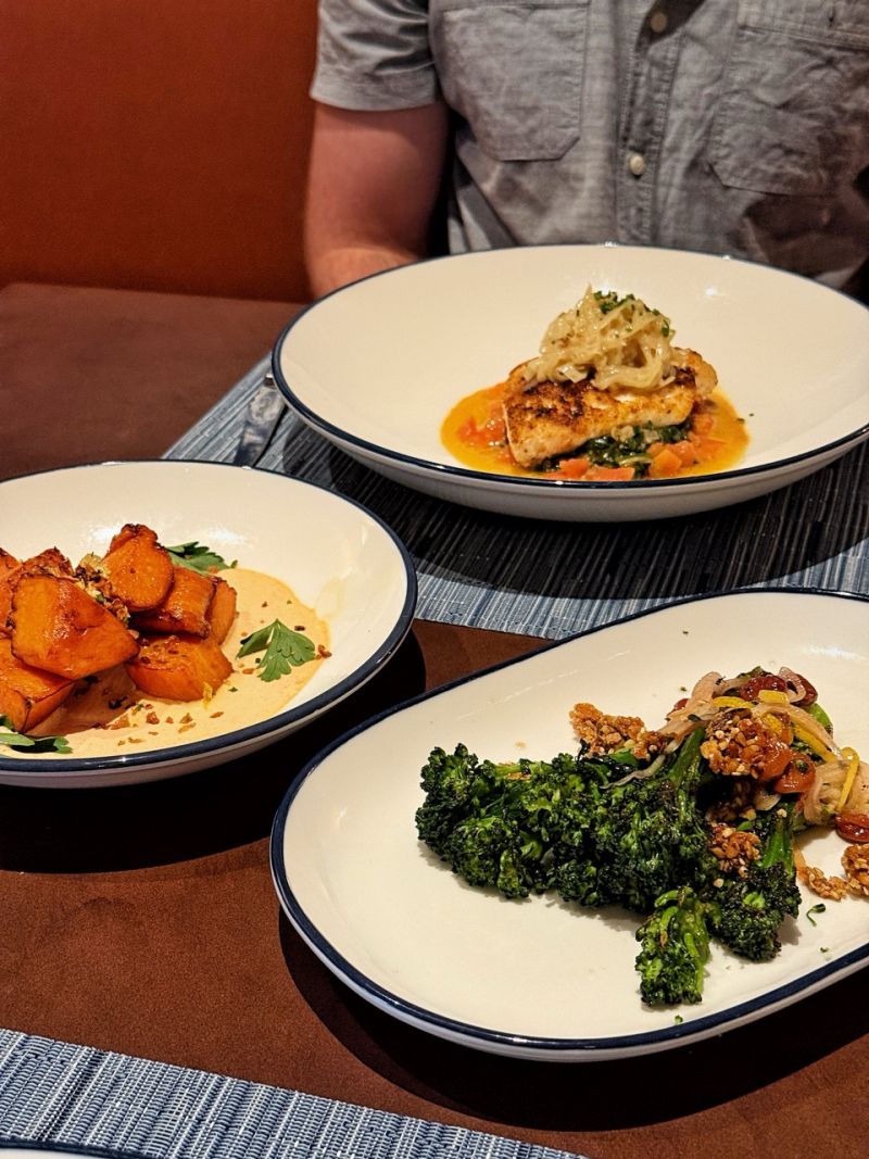 We started our meal with the seared snapper, which was delicately crisped on the outside and buttery tender inside. The Denver cut steak was another standout—rich, flavorful, and even more meaningful when we learned it came directly from one of the owner’s personal farms. It just shows the level of care and attention that goes into the restaurant’s dishes. On the side, we ordered the charred broccoli and batata bravas, both of which held their own and had the perfect texture.