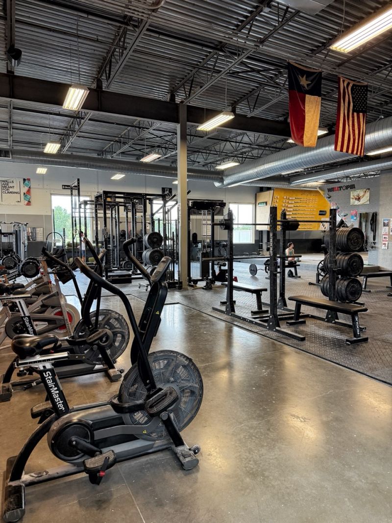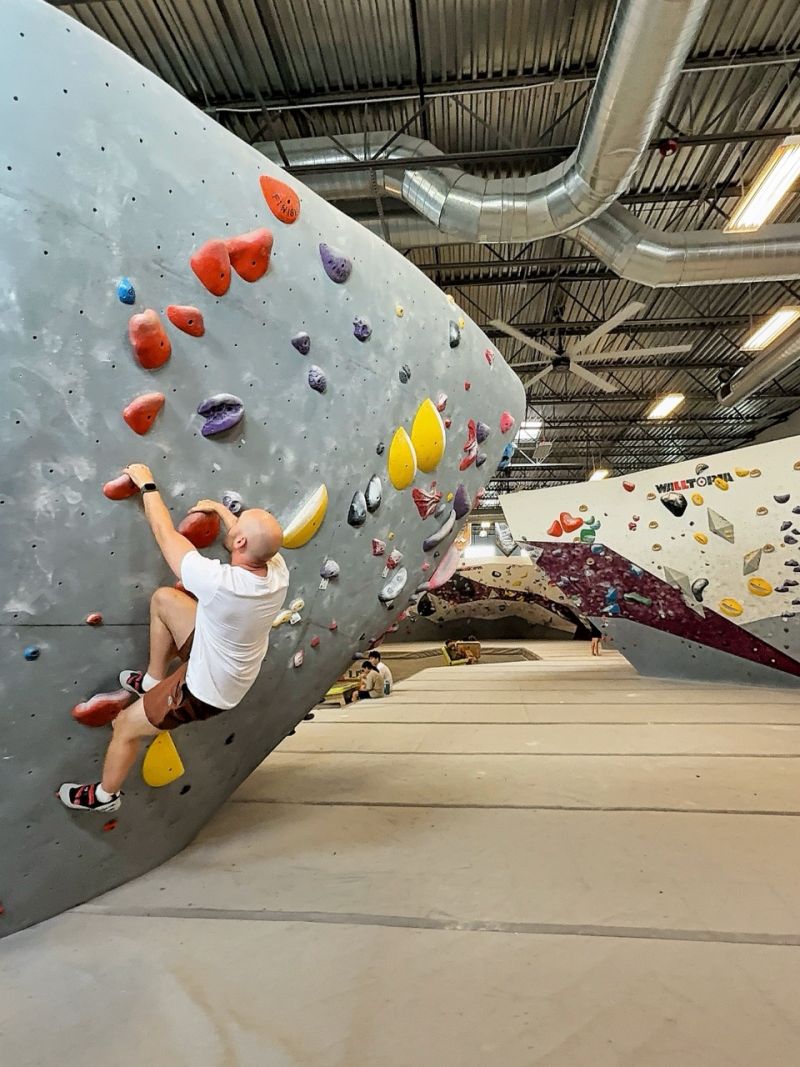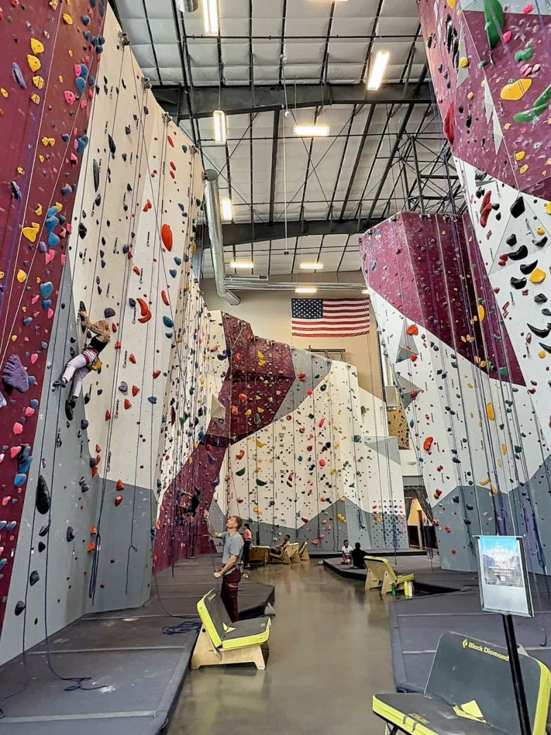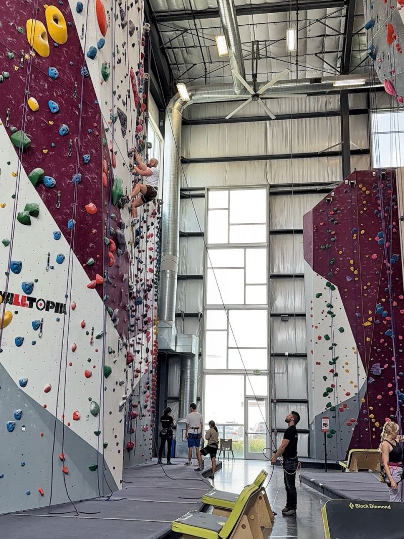 The Katy facility spans a massive 36,000 square feet, with over 20,000 square feet dedicated to roped climbing and another 7,000 square feet of bouldering terrain—including a top-out boulder and kid-friendly zones. There’s also a yoga and fitness studio, cardio equipment, training tools like campus boards, and programs for both kids and adults. We saw climbers of every age and level working on routes that ranged from beginner-friendly V0s to challenging V10s.