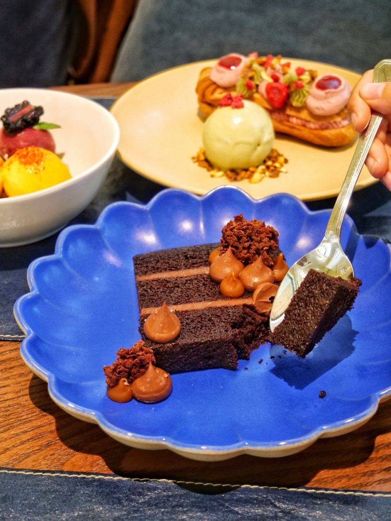 The prix fixe menu lets you choose an appetizer, entrée, and dessert, and while it rotates seasonally, every plate we tried felt like it was crafted with intention. We had a fish with perfectly seared skin, a roasted chicken that was tender and packed with flavor, and a chocolate cake that honestly left us speechless. It was insanely decadent, and a stunner on served on a deep blue plate.
